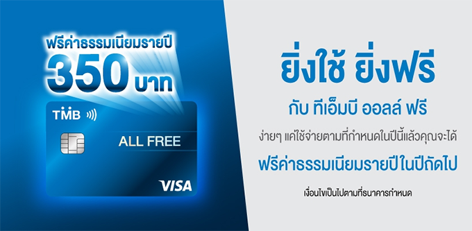 ทีเอ็มบีแจ้งยกเว้นค่าธรรมเนียมรายปี บัญชีทีเอ็มบี ออลล์ ฟรี (TMB All Free) ที่ธนาคารจะเรียกเก็บ 350 บาทต่อ 1 บัญชี เมื่อครบกำหนดในเดือนที่ลูกค้าเปิดบัญชีในปีถัดไป โดยให้ยกเว้นการเรียกเก็บค่าธรรมเนียมรายปีทุกบัญชีทีเอ็มบี ออลล์ ฟรี (TMB ALL FREE) ที่ลูกค้าได้เปิดบัญชีไว้กับธนาคารและทำรายการตามเงื่อนไข ดังต่อไปนี้