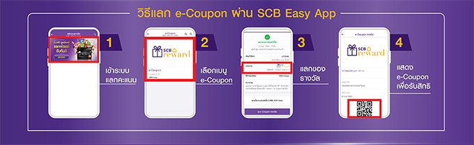 เงื่อนไขทั่วไป - เมื่อผู้ถือบัตร (ผู้ถือบัตร หมายถึง ผู้ถือบัตรเครดิตไทยพาณิชย์ทุกประเภท ยกเว้นผู้ถือบัตรไทยพาณิชย์ทุกประเภท ยกเว้นผู้ถือบัตรเครดิตไทยพาณิชย์ แฟมิลี่ พลัส, บัตรเครดิตไทยพาณิชย์ เอสซีบี เอ็ม วีซ่า และบัตรเครดิตอื่นใดตามที่ธนาคารกำหนดในภายหน้า) ทำรายการแลกของรางวัลที่เป็น e-Coupon ผ่านบริการ SCB Easy Application หรือบริการอื่นใดตามที่ธนาคารอาจมีกำหนดเพิ่มเติมในภายหน้าได้สำเร็จจะได้รับ e-Coupon ที่มี QR Code และ/หรือ Barcode ผ่านบริการ SCB Easy Application หรือบริการอื่นใด ทั้งนี้ผู้ถือบัตรต้องใช้ QR Code และ/หรือ Barcode ดังกล่าว ณ สถานที่ของร้านค้า โดยต้องแสดงต่อพนักงาน/เจ้าหน้าที่ของผู้ให้บริการเพื่อสแกน หรือคีย์ข้อมูลดังกล่าว และต้องใช้ภายในระยะเวลาที่กำหนดตามที่ปรากฎบนหน้าจอของบริการ SCB Easy Application หรือบริการอื่นใดด้วย