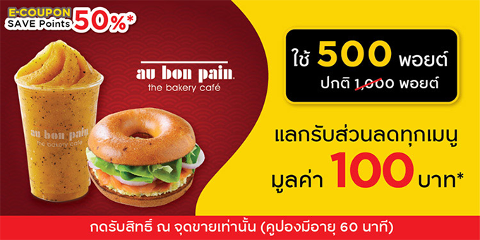 1. E-COUPON Au Bon Pain : แลกรับส่วนลดทุกเมนู มูลค่า 100 บาท* ใช้ 500 คะแนน จากปกติ 1,000 คะแนน