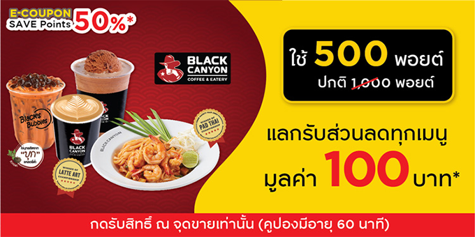 2. E-COUPON Black Canyon : แลกรับส่วนลดทุกเมนู มูลค่า 100 บาท* ใช้ 500 คะแนน จากปกติ 1,000 คะแนน