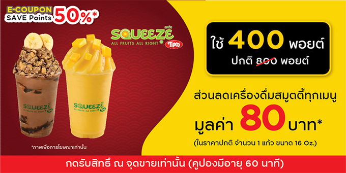 6. E-COUPON SQUEEZE : แลกรับส่วนลดทุกเมนู มูลค่า 80 บาท ขนาด 16 Oz.ใช้ 400 คะแนน จากปกติ 800 คะแนน