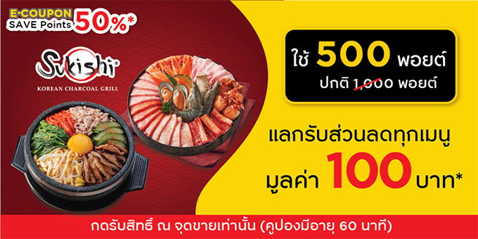 3. E-COUPON Sukishi Korean Chacoal Grill : แลกรับส่วนลดทุกเมนู มูลค่า 100 บาท* ใช้ 500 คะแนน จากปกติ 1,000 คะแนน