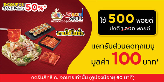 5. E-COUPON Sukishi Seoul Grill : แลกรับส่วนลดทุกเมนู มูลค่า 100 บาท* ใช้ 500 คะแนน จากปกติ 1,000 คะแนน