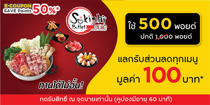 4. E-COUPON Sukishi Buffet : แลกรับส่วนลดทุกเมนู มูลค่า 100 บาท* ใช้ 500 คะแนน จากปกติ 1,000 คะแนน