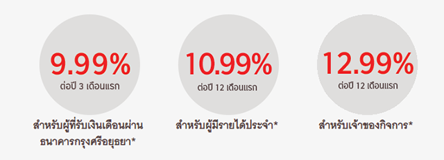 เงื่อนไขการรับอัตราดอกเบี้ยพิเศษ - อัตราดอกเบี้ย 9.99% ต่อปี 3 เดือนแรก สำหรับพนักงานประจำที่รับเงินเดือนผ่านบัญชีของธนาคารกรุงศรีอยุธยา / มีอายุงาน 1 ปีขึ้นไป / มีรายได้ตามหลักเกณฑ์ของธนาคารกรุงศรีอยุธยา และรับเงินกู้โดยวิธีโอนเงินเข้าบัญชีเงินฝากธนาคารเท่านั้น