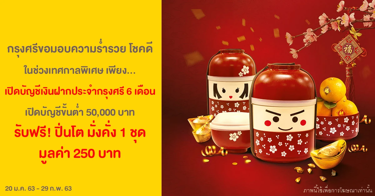 กรุงศรีขอมอบความร่ำรวย โชคดี ในช่วงเทศกาลพิเศษ เพียงเปิด บัญชีเงินฝากประจำกรุงศรี 6 เดือน เปิดบัญชีขั้นต่ำ 50,000 บาท รับฟรี! ปิ่นโต มั่งคั่ง 1 ชุด มูลค่า 250 บาท