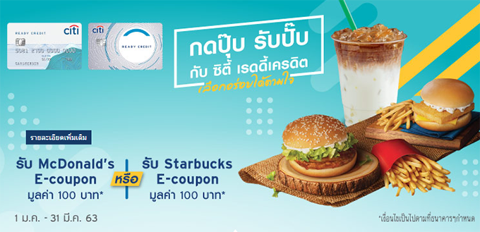 • สมาชิกบัญชีซิตี้ เรดดี้เครดิต รับฟรี! E-coupon มูลค่า 100 บาท ที่ร้าน Starbucks หรือ McDonald's