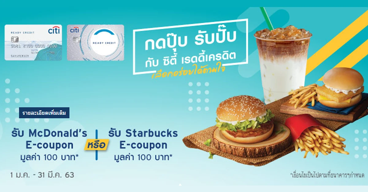 • สมาชิกบัญชีซิตี้ เรดดี้เครดิต รับฟรี! E-coupon มูลค่า 100 บาท ที่ร้าน Starbucks หรือ McDonald's