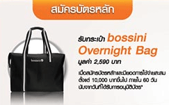 2.1 สมัครบัตรหลัก - รับกระเป๋า Bossini overnight bag มูลค่า 2,590 บาท เมื่อมียอดการใช้จ่ายสะสมตั้งแต่ 10,000 บาทขึ้นไป ภายในระยะเวลา 60 วัน นับจากวันที่ได้รับการอนุมัติ โดยธนาคารจะจัดส่งของกำนัลให้ภายใน 90 วัน นับจากวันใช้จ่ายครบตามหลักเกณฑ์ดังกล่าว