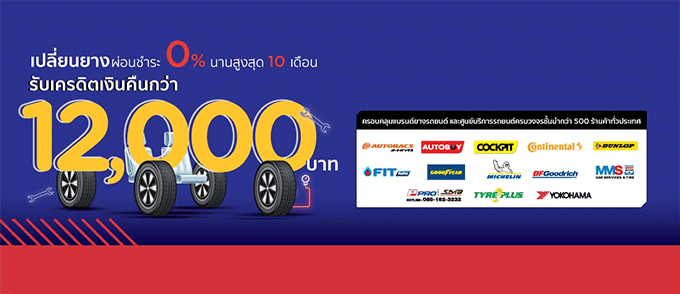 บัตรเครดิต KTC เปลี่ยนยางรอบนี้ได้คุ้มสุด! เมื่อผ่อนชำระ 0% นานสูงสุด 10 เดือน รับเครดิตเงินคืนสูงกว่า 12,000 บาท*