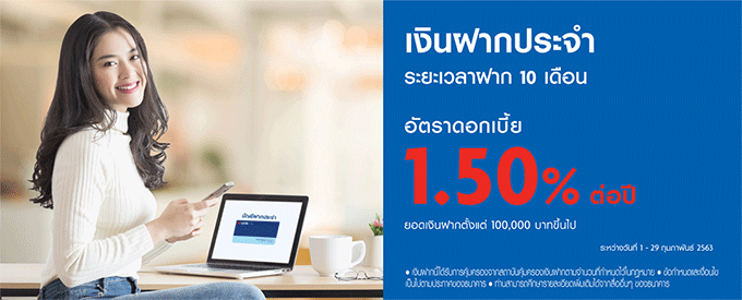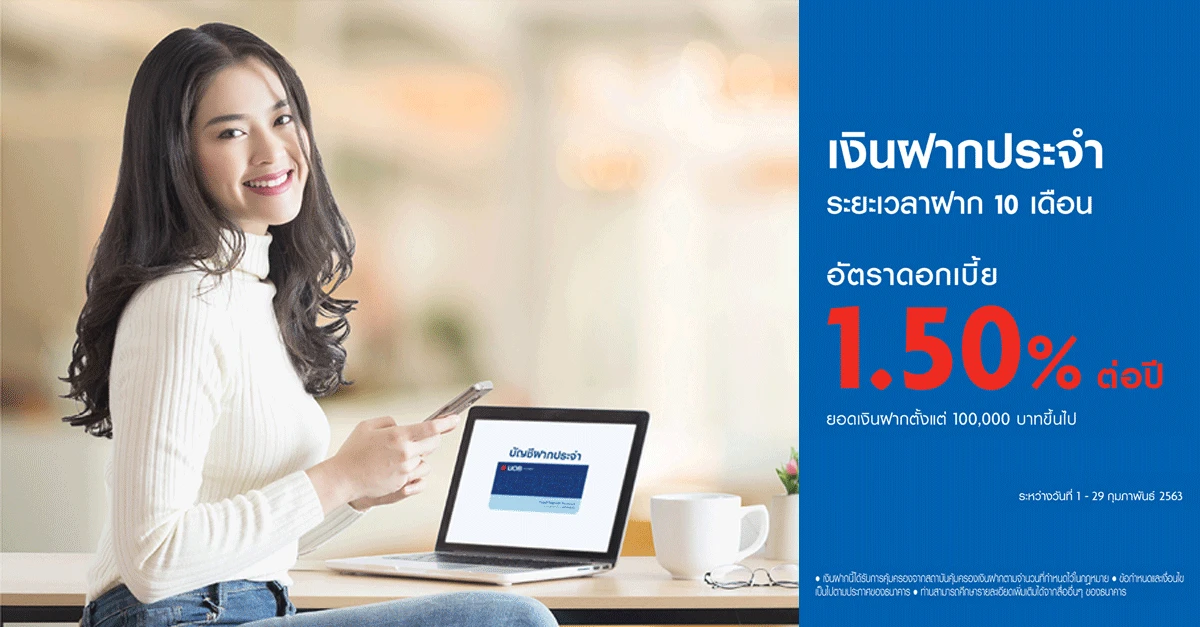 เงื่อนไขสำคัญ - อัตราดอกเบี้ยพิเศษนี้สำหรับลูกค้าประเภทบุคคลธรรมดาที่มาเปิดบัญชีประเภทเงินฝากประจำ ระยะเวลาฝาก 10 เดือน ด้วยยอดเงินฝากตั้งแต่ 100,000 บาท ระหว่างวันที่ 1 - 29 ก.พ. 63 ที่ธนาคารยูโอบีทุกสาขา