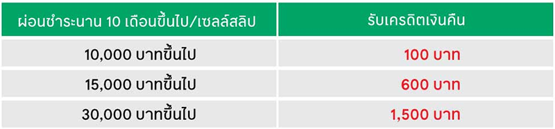 - ยอดผ่อนชำระ 30,000 ขึ้นไป/เซลล์สลิป/ชิ้น นาน 10 เดือนขึ้นไป รับเครดิตเงินคืน 1,500 บาท