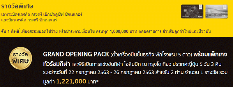 - การรับสิทธิ์ชิงโชครางวัลพิเศษ สงวนสิทธิ์เฉพาะบัตรเครดิต กรุงศรี วีซ่า เอ็กซ์คลูซีฟ ซิกเนเจอร์และบัตรเครดิต กรุงศรี วีซ่า ซิกเนเจอร์ เท่านั้น เพียงสะสมมียอดใช้จ่ายสะสมหรือผ่อนชำระครบทุก 1 ล้านบาทตลอดรายการ รับ 1 สิทธิ์ สำหรับลูกค้าปัจจุบันและลูกค้าใหม่ การรับสิทธิ์ชิงโชครางวัลอื่นๆ เพียงสะสมและมียอดใช้จ่ายสะสมหรือผ่อนชำระครบทุก 1,000 บาทตลอดรายการ รับ 1 สิทธิ์ สำหรับลูกค้าปัจจุบัน และรับ 5 สิทธิ์ สำหรับลูกค้าใหม่
