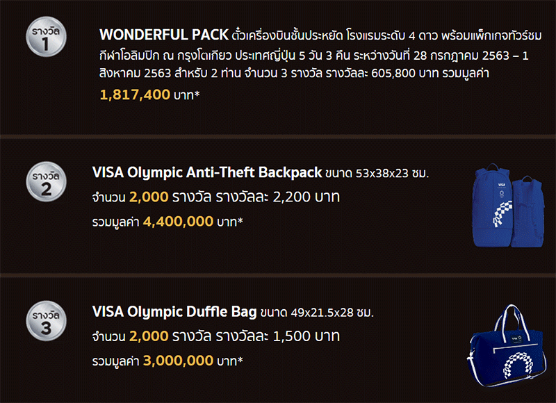 - รายละเอียดของบัตรโดยสารเครื่องบิน และที่พัก ตั๋วการชมกีฬารวมถึงแพ็กเกจทัวร์ เป็นไปตามประเภทที่บริษัท วีซ่า อินเตอร์เนชั่นแนล (ประเทศไทย) จำกัด กำหนด
