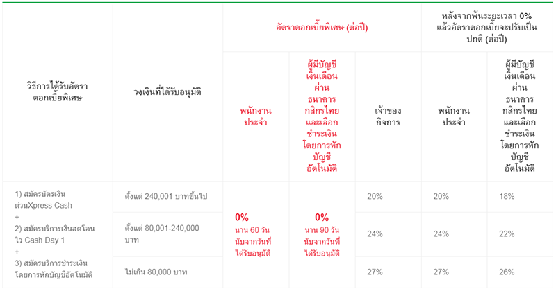 หมายเหตุ - สำหรับพนักงานประจำ ที่สมัครสินเชื่อบัตรเงินด่วน Xpress Cash พร้อมสมัครบริการเงินสดโอนไว Cash Day 1 เพื่อโอนเงินสินเชื่อตั้งแต่ 50% ขึ้นไปของวงเงินที่รับอนุมัติเข้าบัญชีออมทรัพย์ธนาคารกสิกรไทยของลูกค้าผู้กู้