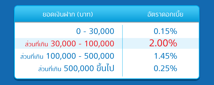 5. ธนาคารคำนวณดอกเบี้ยเป็นรายวันจากยอดเงินคงเหลือ ณ สิ้นวัน ของอัตราดอกเบี้ยตามวงเงินที่ประกาศในขณะนั้น โดยธนาคารจะจ่ายดอกเบี้ยทุกวันที่ 25 ของทุกเดือน