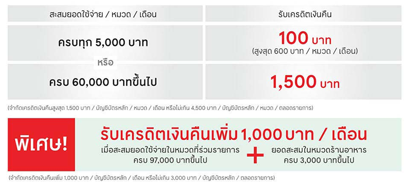 - รับเพิ่มเครดิตเงินคืน 1,000 บาท / บัญชีบัตรหลัก / เดือน เมื่อใช้จ่ายสะสมในหมวดที่ร่วมรายการครบ 97,000 บาทขึ้นไป และมียอดสะสมในหมวดร้านอาหาร 3,000 บาทขึ้นไป (รวมยอดสะสม 100,000 บาท / บัญชีบัตรหลัก / เดือน) รวมรับเครดิตเงินคืนสูงสุด 25,500 บาท / บัญชีบัตรหลัก ตลอดรายการ (ยอดใช้จ่ายจากร้านอาหารในโรงแรมจะถูกนับในหมวดโรงแรมและบริษัททัวร์)