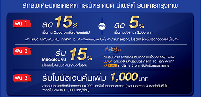• ใช้บัตรเครดิต หรือบัตรเดบิต บีเฟิสต์ ธนาคารกรุงเทพ ชำระค่าอาหารที่โมโม พาราไดซ์ ทุกสาขา รับส่วนลด 15% สำหรับยอดใช้จ่าย 2,000 บาทขึ้นไป/เซลส์สลิป หรือ รับส่วนลด 5% สำหรับยอดใช้จ่ายน้อยกว่า 2,000 บาท/ เซลส์สลิป (สำหรับชุด All-You-Can-Eat ทุกสาขา และ Mo-Mo-Paradise Cafe สาขาเซ็นทรัลเวิลด์, ไม่รวมเครื่องดื่มแอลกอฮอล์และน้ำเปล่า)
