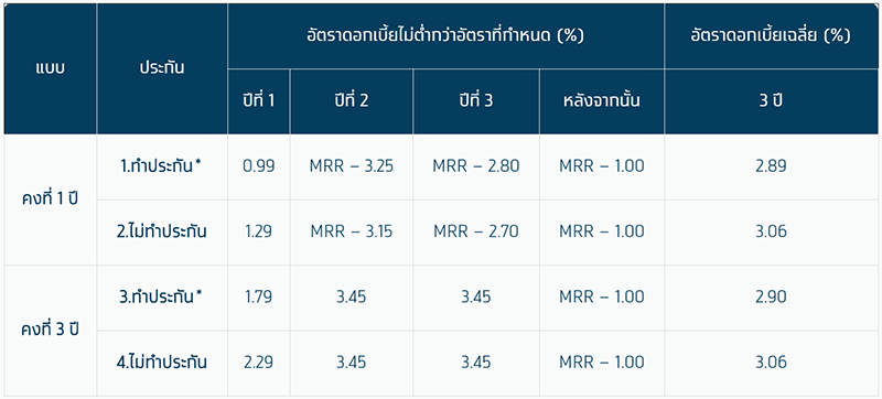ทำประกัน คือ ทำ MRTA / GLTSP เต็มวงเงินกู้ และระยะเวลาทำประกันขั้นต่ำ 10 ปี หรือทำ MRTA / GLTSP70% ของวงเงินกู้และระยะเวลากู้ หรือระยะเวลาทำประกันขั้นต่ำ 15 ปี ทั้งนี้ การทำประกันชีวิตเพื่อคุ้มครองวงเงินสินเชื่อเป็นไปตามความสมัครใจของลูกค้า และไม่มีผลต่อการพิจารณาสินเชื่อ