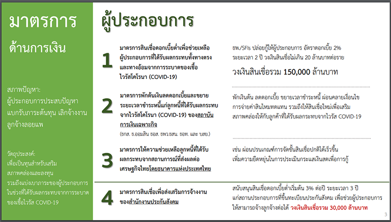 1.1 มาตรการสินเชื่อดอกเบี้ยต่ำเพื่อช่วยเหลือผู้ประกอบการที่ได้รับผลกระทบทั้งทางตรงและทางอ้อม จากการระบาดของเชื้อไวรัสโคโรนา (COVID-19) โดยธนาคารออมสินสนับสนุนเงินทุนดอกเบี้ยต่ำวงเงินรวม 150,000 ล้านบาท ให้แก่สถาบันการเงิน โดยคิดดอกเบี้ยในอัตราร้อยละ 0.01 ต่อปี และสถาบันการเงินให้สินเชื่อแก่ผู้ประกอบการในอัตราร้อยละ 2 ต่อปี ระยะเวลา 2 ปี วงเงินสินเชื่อสูงสุดต่อรายไม่เกิน 20 ล้านบาท