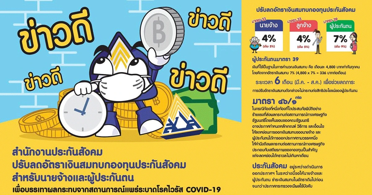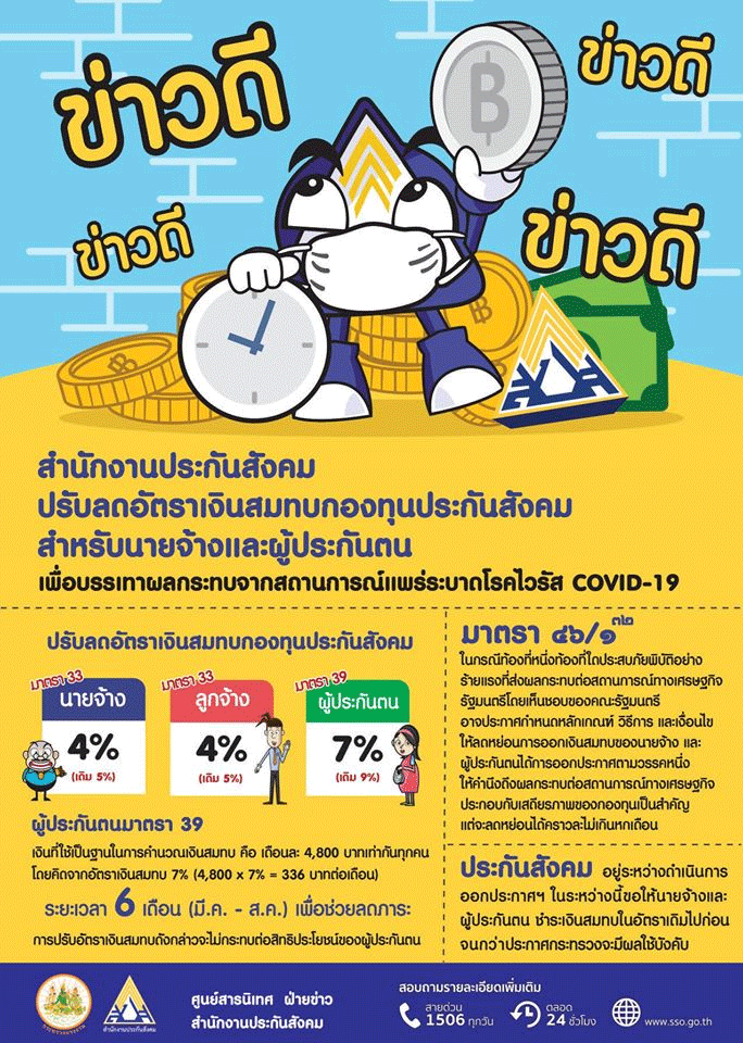 ในการนี้ นายสุทธิ สุโกศล ปลัดกระทรวงแรงงาน ในฐานะประธานกรรมการประกันสังคม เปิดเผยว่า ในการประชุมคณะกรรมการประกันสังคมและที่ปรึกษา เมื่อวันที่ 10 มี.ค. 2563 คณะกรรมการฯ มีมติเห็นชอบในหลักการให้ปรับลดอัตราเงินสมทบกองทุนประกันสังคมให้กับนายจ้าง และผู้ประกันตน ทั้งมาตรา 33 และมาตรา 39 โดยนายจ้าง และผู้ประกันตนมาตรา 33 ปัจจุบันจ่ายฝ่ายละ ร้อยละ 5 ของค่าจ้าง ลดเหลือฝ่ายละ ร้อยละ 4 ของค่าจ้าง