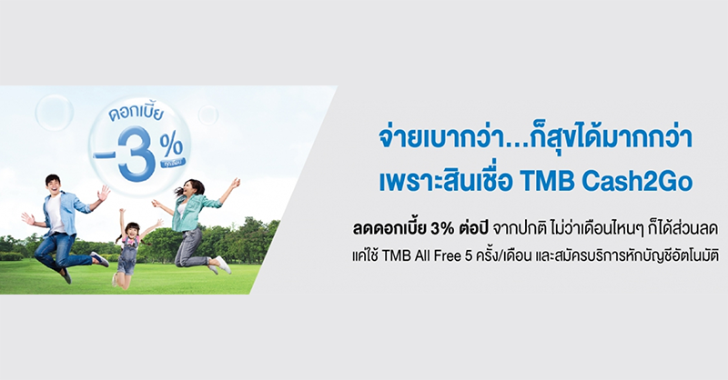 จ่ายเบากว่า...ก็สุขได้มากกว่า เพราะสินเชื่อ TMB Cash2Go ลดดอกเบี้ย 3% ต่อปี ทุกเดือน
