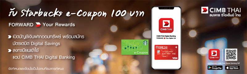 - ผู้ใช้บริการที่เข้าตามเงื่อนไขรายการส่งเสริมการขาย จะได้รับ Starbucks e-Coupon มูลค่า 100 บาท ผ่านทางข้อความ SMS ไปยังหมายเลขโทรศัพท์ที่ผู้ใช้บริการได้ให้ไว้เท่านั้น ภายใน 30 วันทำการ หลังลงทะเบียนเข้าใช้แอปฯ CIMB THAI Digital Banking โดยสามารถนำไปใช้ได้กับการซื้อสินค้า อาหารและเครื่องดื่ม ที่ร้าน Starbucks ทุกสาขาทั่วประเทศ