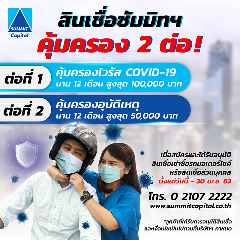 บริษัท ซัมมิท แคปปิตอล ลีสซิ่ง จำกัด ผู้นำธุรกิจสินเชื่อเช่าซื้อรถจักรยานยนต์ในประเทศไทย พร้อมดูแลและเดินเคียงข้างคนไทย ด้วยการมอบความห่วงใย 2 ต่อ กับแผนคุ้มครองสุขภาพจากไวรัสโคโรนา (COVID-19) นาน 12 เดือน สูงสุด 100,000 บาท และแผนคุ้มครองอุบัติเหตุ นาน 12 เดือน สูงสุด 50,000 บาท เพียงสมัครสินเชื่อเช่าซื้อรถมอเตอร์ไซค์ หรือสินเชื่อส่วนบุคคล และได้รับการอนุมัติ ตั้งแต่วันนี้จนถึง 30 เมษายน 2563