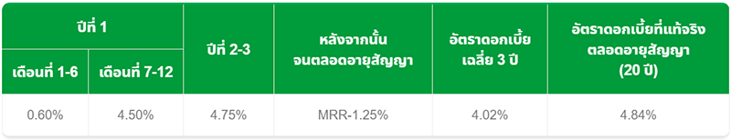- อัตราดอกเบี้ยที่แท้จริง (Effective Interest Rate) คำนวณจากวงเงินกู้ 1 ล้านบาท อายุสัญญา 20 ปี