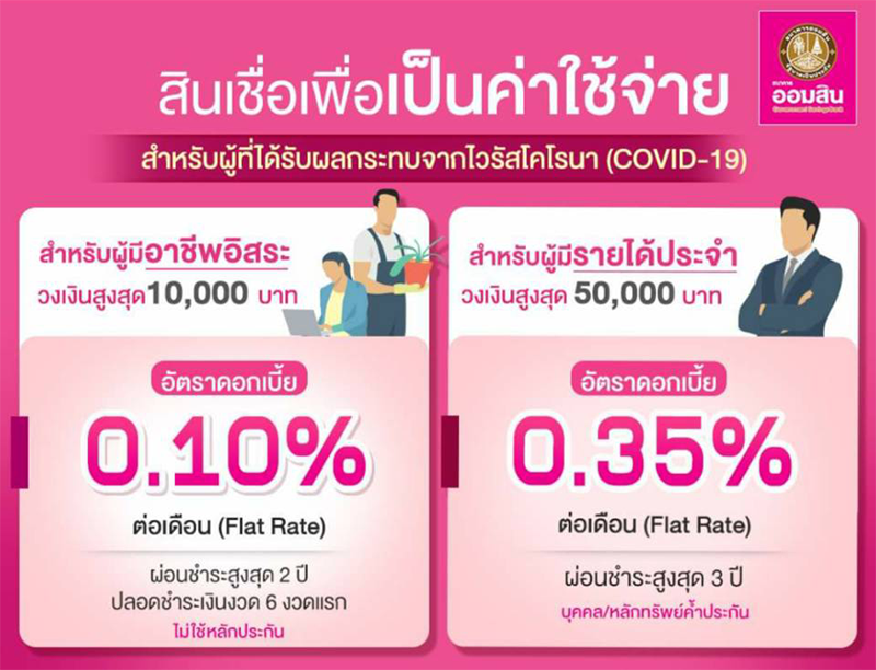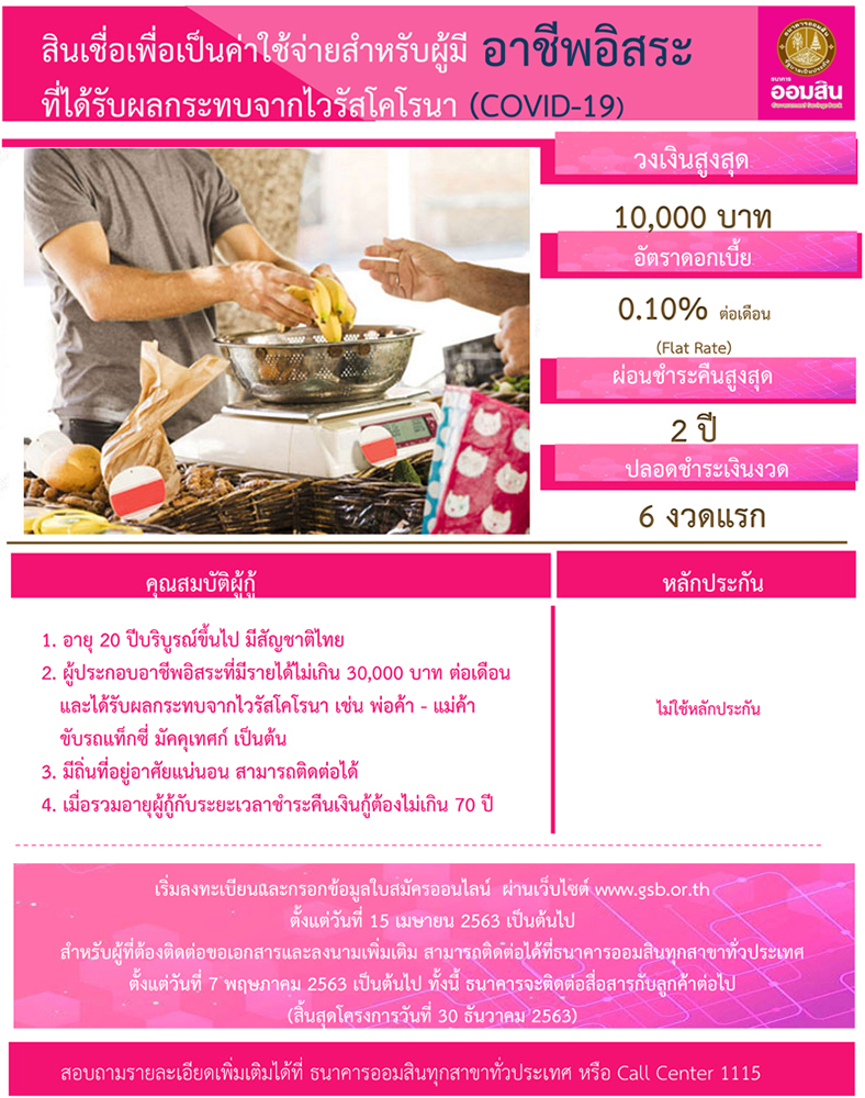 สำหรับ "โครงการสินเชื่อฉุกเฉิน" ตามมติคณะรัฐมนตรีนั้น ธนาคารออมสินสนับสนุนสินเชื่อวงเงินรวม 20,000 ล้านบาท ให้บริการด้วยสินเชื่อเพื่อเป็นค่าใช้จ่ายสำหรับผู้มีอาชีพอิสระที่ได้รับผลกระทบจากไวรัสโคโรนา (COVID-19) วงเงินกู้ต่อรายสูงสุด 10,000 บาท อัตราดอกเบี้ย 0.10% ต่อเดือน (Flat Rate) ผ่อนชำระคืนนานถึง 2 ปี โดยไม่ต้องชำระเงินกู้ 6 งวดแรก ที่สำคัญคือไม่ต้องใช้หลักประกันใดๆ คุณสมบัติผู้กู้ มีสัญชาติไทย อายุ 20 ปีขึ้นไป มีถิ่นที่อยู่อาศัยแน่นอน สามารถติดต่อได้ ประกอบอาชีพอิสระที่มีรายได้เดือนละไม่เกิน 30,000 บาท ได้รับผลกระทบจาก COVID-19 เช่น พ่อค้าแม่ค้า คนขับรถโดยสารแท็กซี่-สามล้อ มัคคุเทศก์ เป็นต้น