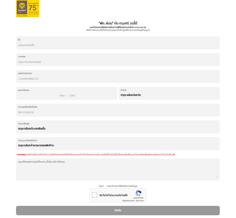 "กรุงศรี ออโต้" ผู้นำธุรกิจสินเชื่อยานยนต์ครบวงจร เครือธนาคารกรุงศรีอยุธยา จำกัด (มหาชน) เปิดตัวระบบให้บริการลูกค้าบนเว็บไซต์ (On Web Request) เพื่อรองรับโครงการ "พัก...ผ่อน กับกรุงศรี ออโต้" เพื่อเป็นอีกหนึ่งช่องทางในการอำนวยความสะดวกให้แก่ลูกค้าที่ได้รับผลกระทบจากการแพร่ระบาดของเชื้อไวรัสโคโรนา 2019 (COVID-19) โดยสามารถยื่นคำร้องเพื่อขอพักชำระหนี้ตลอด 24 ชั่วโมง ครบจบภายในลิ้งก์เดียว