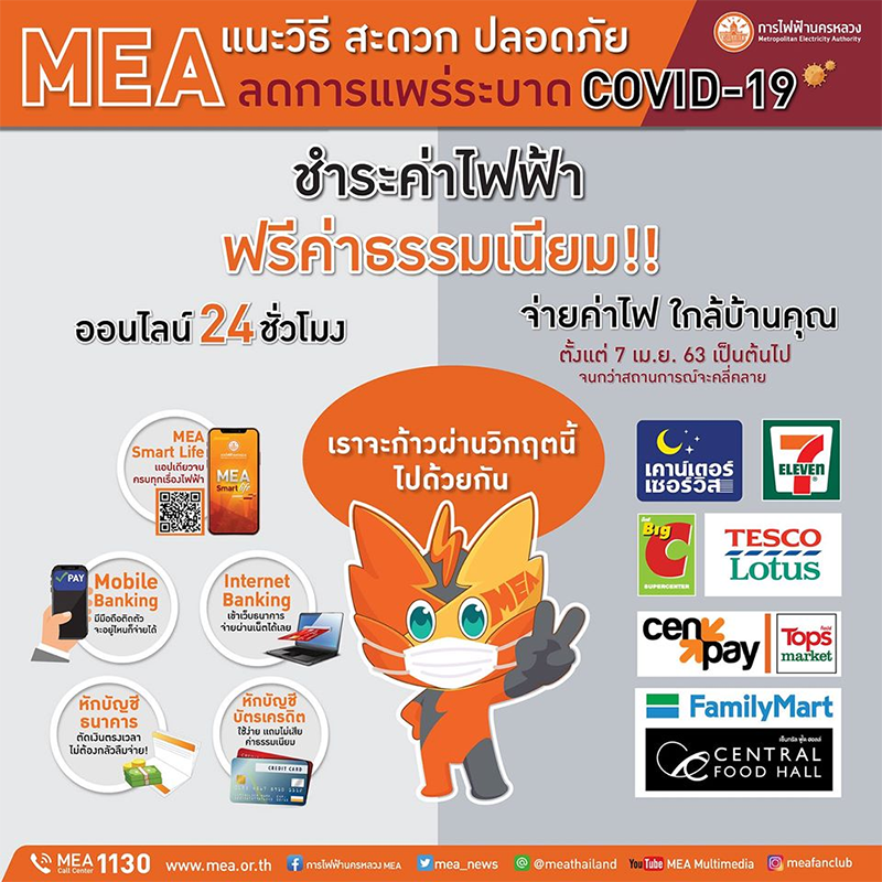 MEA แนะวิธีจ่ายค่าไฟ "ฟรีค่าธรรมเนียม" สะดวกสุด รวดเร็ว ปลอดภัย ตลอด 24 ชม. ไม่ต้องเดินทางเสี่ยงการติดเชื้อไวรัส