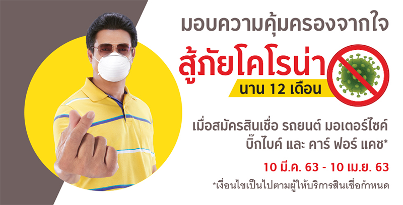 มอบความคุ้มครองจากใจ สู้ภัยโคโรน่า นาน 12 เดือน พิเศษเฉพาะลูกค้าบุคคลธรรมดาที่สมัครสินเชื่อ รถยนต์ มอเตอร์ไซค์ บิ๊กไบค์ และ คาร์ ฟอร์ แคช ด้วยประกันภัย ไวรัสโคโรน่า Corona virus (COVID-19)