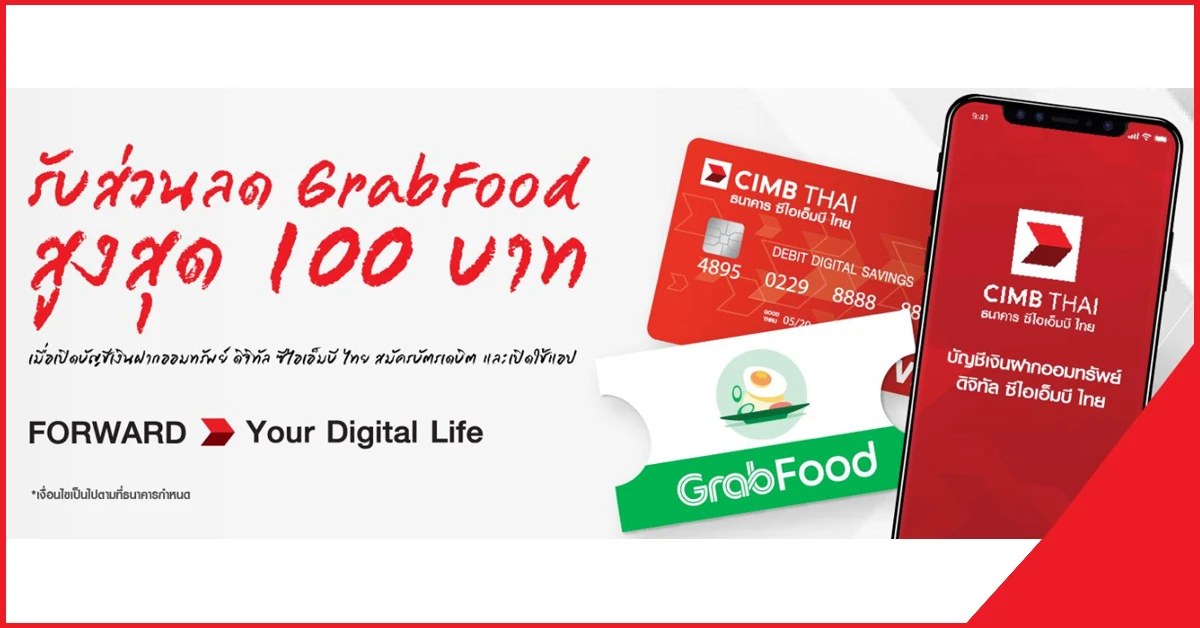 - เฉพาะลูกค้าธนาคาร ซีไอเอ็มบีไทย จำกัด (มหาชน) (ธนาคาร) ที่มีแอปพลิเคชัน CIMB THAI Digital Banking สมัครผลิตภัณฑ์และบริการตามที่ธนาคารกำหนด ระหว่างวันที่ 13 เมษายน 2563 - 12 มิถุนายน 2563 รับส่วนลด Grabfood มูลค่า 50 บาท (ไม่รวมค่าจัดส่ง)