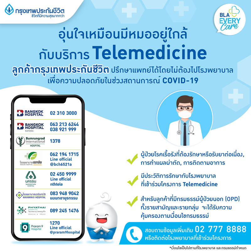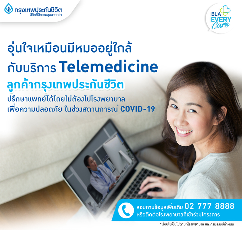กรุงเทพประกันชีวิต จับมือโรงพยาบาลคู่สัญญามอบ บริการแพทย์ทางไกล (Telemedicine) ผ่านระบบเทคโนโลยีสมัยใหม่ อำนวยความสะดวก รวดเร็วในการดูแล ติดตาม ให้คำแนะนำ การติดตามผล และความปลอดภัยให้กับผู้ถือกรมธรรม์ รวมถึงสามารถเคลมค่าใช้จ่ายที่เกิดขึ้นผ่านทางระบบออนไลน์ เพื่อลดอัตราการเดินทางไปยังสถานที่สาธารณะภายใต้สถานการณ์การแพร่ระบาดของโรคติดเชื้อไวรัสโคโรนา 2019 (COVID-19)