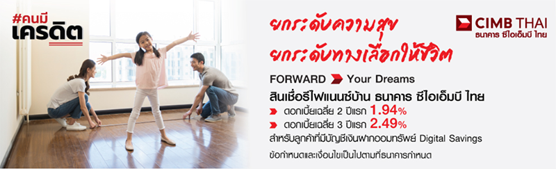 ยกระดับความสุข ยกระดับทางเลือกให้ชีวิต Forward >> Your Dreams สินเชื่อรีไฟแนนซ์บ้าน ธนาคาร ซีไอเอ็มบี ไทย