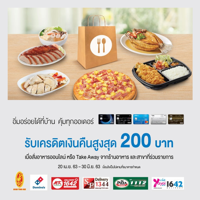 - รับเครดิตเงินคืน 50 บาท เมื่อสั่งอาหารออนไลน์ หรือ Take Away ตั้งแต่ 400 บาทขึ้นไป จากร้านอาหาร และสาขาที่ร่วมรายการ ได้แก่ Boon Tong Kee, Domino?s, MK Delivery 1642, S&P, The Pizza Company 1112 และ Yayoi