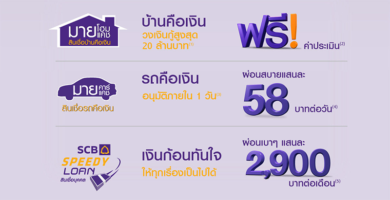 - สินเชื่อบ้านคือเงิน My Home My Cash และสินเชื่อรถคือเงิน My Car My Cash ลูกค้าจะได้รับ Tesco Lotus Gift Voucher มูลค่ารวม 200 บาท ต่อ 1 บัญชีเงินกู้