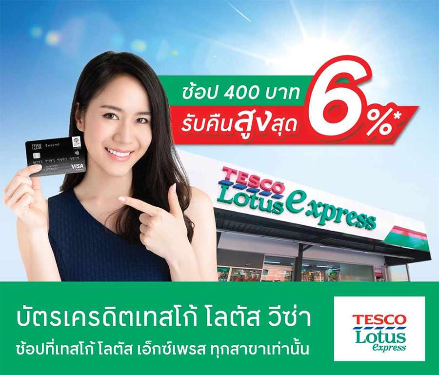สิทธิพิเศษสำหรับลูกค้า บัตรเครดิตเทสโก้ โลตัส วีซ่า ช้อป 400 บาท รับคืนสูงสุด 6% ที่เทสโก้ โลตัสเอ็กซ์เพรส หมายเหตุ : - ช้อปครบทุก 400 บาท/เซลล์สลิป รับเครดิตเงินคืน 10 บาท (จำกัดยอดใช้จ่ายสูงสุด 2,000 บาท หรือ เครดิตเงินคืนสูงสุด 50 บาท/บัญชีบัตรหลัก/เดือน) (จำกัดเครดิตเงินคืนรวมสูงสุด 150 บาท/บัญชีบัตรหลัก/ตลอดรายการ หรือ ยอดใช้จ่ายสูงสุด 6,000 บาท/บัญชีบัตรหลัก/ตลอดรายการ)