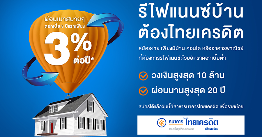 รีไฟแนนซ์บ้านต้องไทยเครดิต ผ่อนสบายๆ ดอกเบี้ย 3 ปีแรก เพียง 3% ต่อปี