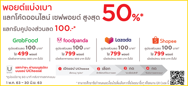 พอยต์แบ่งเบา แลกโค้ดออนไลน์ เซฟพอยต์ สูงสุด 50%* แลกรับคูปอง ส่วนลด 100 บาท ผ่านเมนูคูปองบนแอปฯ UChoose สิทธิพิเศษสำหรับสมาชิก