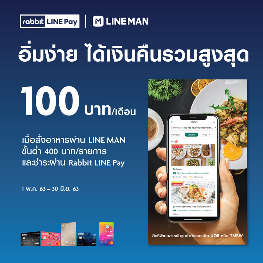 รับเครดิตเงินคืนเข้ากระเป๋าเงิน Rabbit LINE Pay 50 บาท เมื่อมียอดใช้จ่ายค่าอาหารที่แอปพลิเคชัน LINE MAN ตั้งแต่ 400 บาทขึ้นไป/เซลล์สลิป และชำระเงินผ่าน Rabbit LINE Pay ด้วยบัตรเครดิตยูโอบี/ บัตรเครดิต TMRW ระหว่าง วันที่ 1 พ.ค. 2563 - 30 มิ.ย. 2563 (รับเครดิตเงินคืน 50 บาท/เซลล์สลิป จำกัด 2 สิทธิ์ 100 บาท/ ลูกค้า / เดือน)