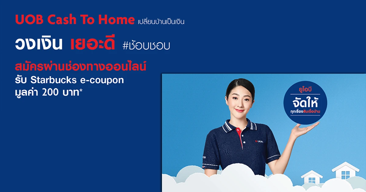 สมัครสินเชื่อ UOB Cash To Home เปลี่ยนบ้านเป็นเงิน ผ่านช่องทางออนไลน์ รับ Starbucks e-coupon มูลค่า 200 บาท