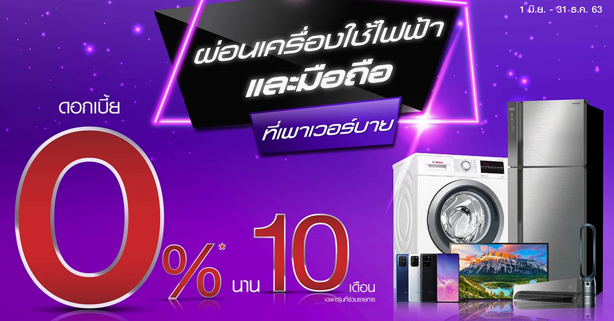 • เมื่อผ่อนสินค้ายอดสินเชื่อตั้งแต่ 3,000 บาทขึ้นไป ต่อเซลล์สลิป ผ่านวงเงินสินเชื่อยัวร์แคช หรือเมื่อผ่อนสินค้ายอดสินเชื่อตั้งแต่ 5,000 บาทขึ้นไป ผ่านวงเงินบัตรเครดิต รับสิทธิ์อัตราดอกเบี้ย 0% ต่อเดือน ระยะเวลาผ่อน 10 เดือน