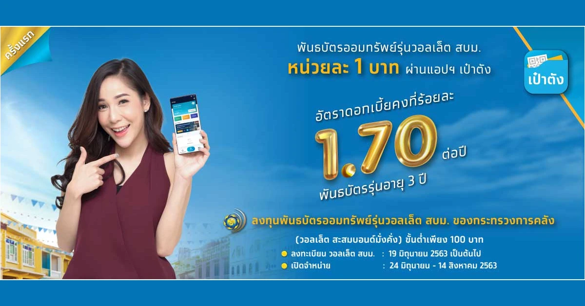 ครั้งแรก...การจำหน่ายพันธบัตรออมทรัพย์รุ่น วอลเล็ต สบม. ของกระทรวงการคลัง ในปีงบประมาณ พ.ศ. 2563 สะดวก ง่าย ไม่ต้องไปสาขา ซื้อได้ตลอด 24 ชั่วโมง หน่วยละ 1 บาท ผ่านแอปฯ เป๋าตัง