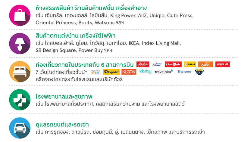 1. หมวดห้างสรรพสินค้า (อาทิ ห้างเซ็นทรัล, เดอะมอลล์, ดิ เอ็มโพเรียม, ดิ เอ็มควอเทียร์, สยามพารากอน, โรบินสัน, King Power) แฟชั่น และเครื่องสำอาง (อาทิ H&M, AIIZ, Uniqlo, Cute Press, Oriental Princess) รวมถึงรายการใช้จ่ายออนไลน์ผ่านเว็บไซต์ของห้างสรรพสินค้า/ร้านค้าโดยตรง