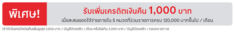 - รับเครดิตเงินคืนเพิ่ม 1,000 บาท / บัญชีบัตรหลัก / เดือน เมื่อสะสมยอดใช้จ่ายภายใน 5 หมวดที่ร่วมรายการ (สามารถสะสมหมวดใดหมวดหนึ่งได้) จำกัดรับคืนสูงสุด 3,000 บาท / บัญชีบัตรหลัก / ตลอดรายการ