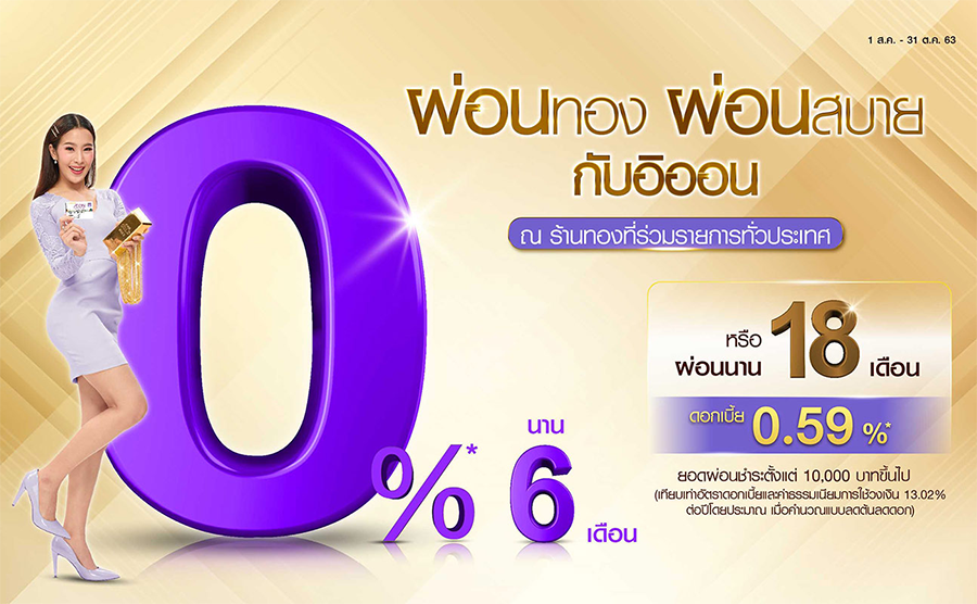 ผ่อนทอง รับดอกเบี้ย 0% (เฉพาะสินค้าที่ร่วมรายการ) หรือ 0.59% นาน 18 เดือน (ทุกชิ้น ทั้งร้าน, ยอดสินเชื่อ 10,000 บาทขึ้นไป) ณ ร้านทองทั่วประเทศ ที่ร่วมรายการ