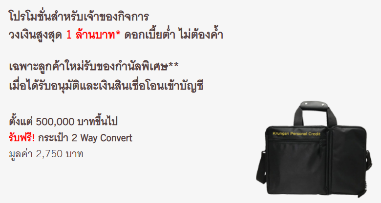 โปรโมชั่นสำหรับผู้มีรายได้ประจำ อนุมัติเร็ว วงเงินสูง ผ่อนสบาย 12 - 60 เดือน ดอกเบี้ยต่ำสุด 9.99% ต่อปี สำหรับผู้ที่กรอกข้อมูลผ่าน www.krungsri.com และรับเงินกู้โดยวิธีโอนเงินเข้าบัญชีเงินฝากธนาคาร