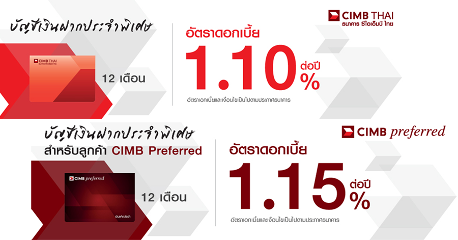 บัญชีเงินฝากประจำพิเศษ 12 เดือน CIMB Preferred and CIMB Thai Private Banking สำหรับลูกค้า CIMB Preferred หรือ CIMB Thai Private Banking ประเภทลูกค้าบุคคลธรรมดาเท่านั้น หรือสมัครเป็นลูกค้า CIMB Preferred หรือ CIMB Thai Private Banking ในวันและเวลาเดียวกันกับการขอเปิดบัญชี